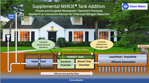 • I/A technologies improve the architecture of Title 5 systems by adding an interim step to effluent treatment (see above graphic) that actually releases most of the inert nitrogen gas back to the atmosphere instead of discharging it into a leaching field – and hence into groundwater. [Source: NEWEA]