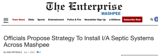 So we were heartened when four Mashpee elected town officials decided that waiting for sewering in their town wasn’t good enough. These officials have proposed a “coordinated approach to reducing nutrient loading that would require certain residents to install innovative/alternative, or I/A, septic systems to work in tandem with the town’s sewer system project.” [Read the article: Mashpee Enterprise, April 1, 2022]